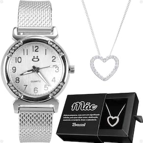 Relógio feminino aço inox prata caixa colar coração mãe inoxidável moda social presente casual Não perca a chance de presentear a Maria Mãe da sua vida com este incrível kit especial