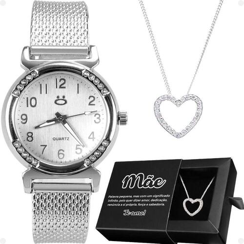 Relógio Feminino Aço Inox Prata Caixa Colar Coração Mãe