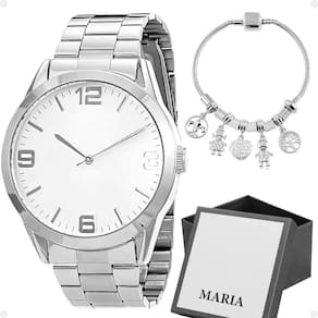 Relogio Feminino Aço Inox Prata + Caixa + Pulseira Pandora Kit Feminino Orizom Maria - Relógio Analógico + Pulseira Estilo Pandora + Caixa Premium Encante-se com a delicadeza do Relógio Feminino Analógico Orizom Maria. Com formato redondo e diâmetro de aproximadamente 3,5 cm, o modelo Maria possui mostrador prata e maquinário todo em aço inoxidável, garantindo durabilidade e sofisticação. A pulseira também é confeccionada em aço inoxidável prata, proporcionando um visual elegante e moderno.