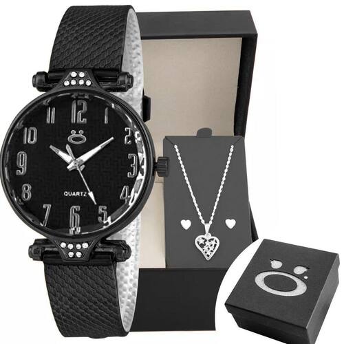 Relogio Feminino Aço Preto + Caixa + Brinco Colar Coração Social Ponteiro Presente Relógio e acessórios femininos orizom - modelo maria - elegância e qualidade premium