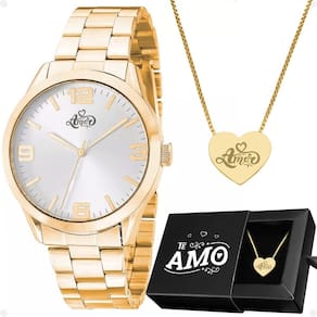 Kit de Presente Orizom Maria - Relógio Feminino, Colar e Pingente- Relógio Feminino Orizom Maria - Cor: Dourado - Material: Aço inoxidável - Tipo de Banho: Banhado - Tampa blindada com arte exclusiva "Eu te Amo" em formato de coração- Colar Banhado - Comprimento: Aproximadamente 42 cm- Pingente Banhado - Formato: Coração - Detalhe: Gravado a laser com a palavra "Amor" de alta precisão- Caixa Premium Orizom Maria - Temática: "Te Amo" gravado - Ideal para guardar acessórios e presentearEste kit é perfeito para o Dia dos Namorados ou para presentear a pessoa amada. Acompanha uma linda caixa temática, tornando-o uma excelente escolha para demonstrar seu amor e carinho. Aproveite essa oportunidade e adquira já!