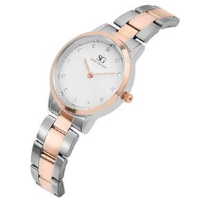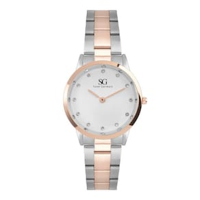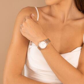 O novo lançamento Belmont Diamond Bicolor é definitivamente um relógio intrigante. O mostrador redondo apresenta índices de cristal brilhante dispostos de forma elegante. Ao mesmo tempo, a pulseira em dois tons, prata e rose, contrasta delicadamente com fundo branco e luminoso do relógio. Juntos, eles formam um relógio completo e único.
