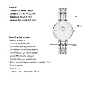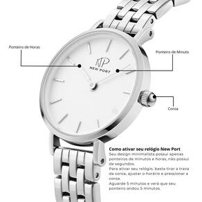 Especificações Técnicas: - Relógio analógico; - Caixa de aço inoxidável; - Pulseira de elos em aço inoxidável; - Mostrador de mineral resistente; - Movimento de Quartzo Japonês; - Design Casual e Elegante; - Resistente apenas a respingos; - Todos os relógios acompanham caixa New Port; - Possui manual; - Bateria 377 para maior durabilidade; - Garantia contra defeito de fábricação. Após a confirmação de compra, o código de rastreio será enviado em até um dia útil em seu e-mail. Marca: New Port
