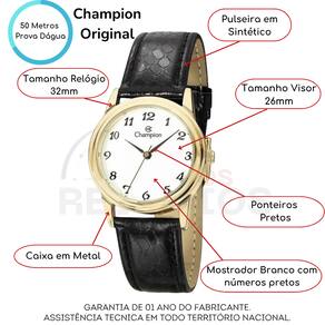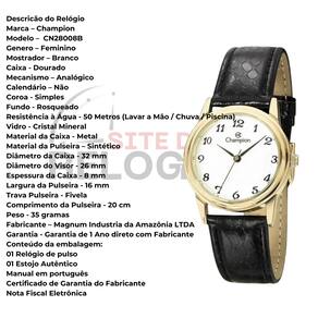 Descricão do Relógio Marca – Champion Modelo – CN28008B Genero – Feminino Mostrador – Branco Caixa - Dourado Mecanismo – Analógico Calendário – Não Coroa - Simples Fundo - Rosqueado Resistência à Água - 50 Metros (Lavar a Mão / Chuva / Piscina) Vidro - Cristal Mineral Material da Caixa - Metal Material da Pulseira – Sintético Diâmetro da Caixa - 32 mm Diâmetro do Visor - 26 mm Espessura da Caixa - 8 mm Largura da Pulseira - 18 mm Trava Pulseira - Fivela Comprimento da Pulseira - 20 cm Peso - 38 gramas Fabricante – Magnum Industria da Amazônia LTDA Garantia - Garantia de 1 Ano direto com Fabricante Conteúdo da embalagem: 01 Relógio de pulso 01 Estojo Autêntico Manual em português Certificado de Garantia do Fabricante procedência garantida Eletrônica
