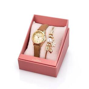 Marca: Condor Embalagem personalizada Condor Estilos: Clássico, Casual, Urbano Modelo: Analógico Material da Caixa peça onde fica o mostrador : Aço Inoxidável Comprimento da pulseira: 20 cm Largura da pulseira: 1,1 cm Tipo de fecho: Fivela Ajustável Diâmetro do mostrador: 2,2 cm Diâmetro do display incluindo coroa : 2,7 cm Espessura do display: 8 mm Material da pulseira: Material Sintético Cor da caixa: Dourada Cor da pulseira: Marrom Claro Cor do fundo: Dourado Números Dourados Acompanha Pulseira Com Berloques