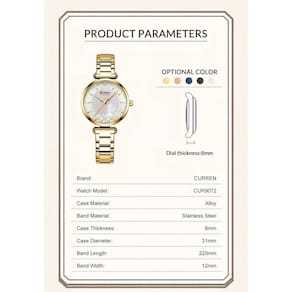 Com movimento de quartzo de alta precisão, ele garante pontualidade absoluta em todos os momentos. Sua pulseira metálica fina e confortável realça a delicadeza do pulso feminino, enquanto o vidro resistente oferece durabilidade e estilo no uso diário.