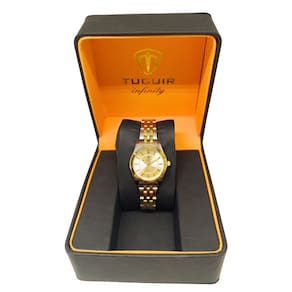 Relógio Feminino de Aço Tuguir Analógico 2462H Dourado e PrataMarca: Tuguir Categoria: Analógico Analógico: Sim (1 Horário) Ponteiros Fluorescentes: Sim Digital: Não Luz: NãoResistente à Água: 5 ATM (Pode ser utilizado para nadar no raso, por pouco tempo submerso) - Respingos: Sim - Chuva: Sim - Lavar Carro: Sim - Lavar Louça: Sim - Natação: Sim - Mergulho: Não Característica do Vidro: Cristal Mineral Tipo de Fecho: Dobrável com Botão Cor da Caixa: Prata Material da Caixa: Aço Formato da Caixa: Redondo Diâmetro da Caixa: 28,00 (mm) Espessura da Caixa: 8,00 (mm) Cor da Pulseira: 129,99 Material da Pulseira: Aço Largura da Pulseira: 12,00 (mm) Comprimento Máximo da Pulseira: 220,00 (mm) Alimentação: Bateria Interna Peso Líquido: 0,050 Kg Modelo: 2462H Cor Predominante: Dourado Cor Diferencial: Prata Garantia: 12 MesesConteúdo da Embalagem: 01 Relógio 01 Embalagem 01 Termo de Garantia