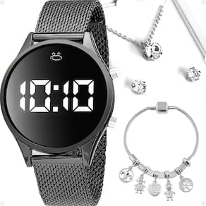 Adquira já o elegante Kit Feminino Orizom Maria, composto por um Relógio Digital, Colar, Pingente, Par de Brincos e uma Pulseira Estilo, todos em aço inoxidável.