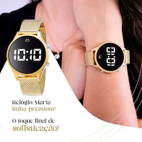 Kit Feminino Orizom Maria - Relógio Digital e Conjunto de Joias- Relógio Feminino Digital Orizom Maria - Modelo: Maria - Formato: Redondo - Diâmetro da Caixa: Aprox. 3,5 cm - Cor: Dourado Banhado - Mostrador: Preto com números brancos (ou vermelhos) - Material: Maquinário em aço inoxidável - Tampa: Blindada com arte exclusiva e logo da Orizom - Pulseira: Silicone, ajustável, para qualquer tamanho de pulso- Colar Banhado - Comprimento: Aprox. 45 cm - Detalhe: Pingente com pedra de strass transparente- Par de Brincos - Formato igual ao do pingente- Caixa Premium Orizom Maria - Modelo: Maria - Arte: Exclusiva - Função: Acomodar com elegância e segurançaO Kit Feminino Orizom Maria - Relógio Digital e Conjunto de Joias é perfeito para presentear a Maria da sua vida. Com sofisticação e funcionalidade, este conjunto é ideal para ocasiões especiais, valorizando cada detalhe. Adquira já o seu!
