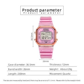 Diâmetro do mostrador: 38 mm Material pulseira: silicone Largura da pulseira: 20mm Comprimento da pulseira: 23.5mm Fecho: fivela Formato do mostrador: quadrado Espessura mostrador: 10mm