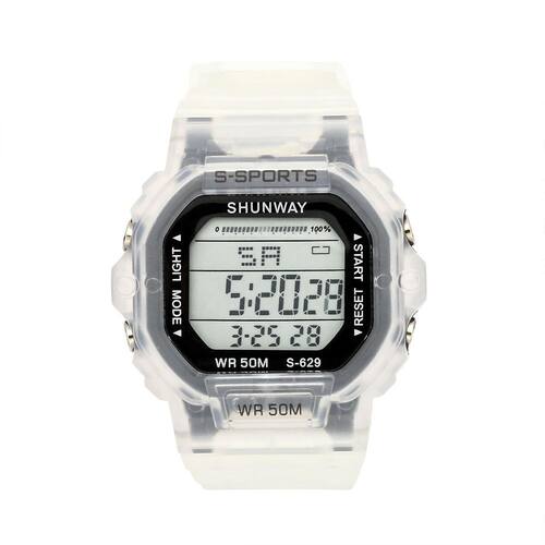 Relógio Feminino S629-01-1 O Relógio Feminino Digital Esportivo é perfeito para quem busca estilo, praticidade e resistência no dia a dia. Com design moderno transparente, ele combina com qualquer look, seja para atividades esportivas ou uso casual.\nPossui display digital de fácil leitura, luz LED para visualizar as horas no escuro e diversas funções úteis para o cotidiano.\nAlém disso, conta com resistência à água de até 50 metros (WR50M), oferecendo mais segurança para uso diário.
