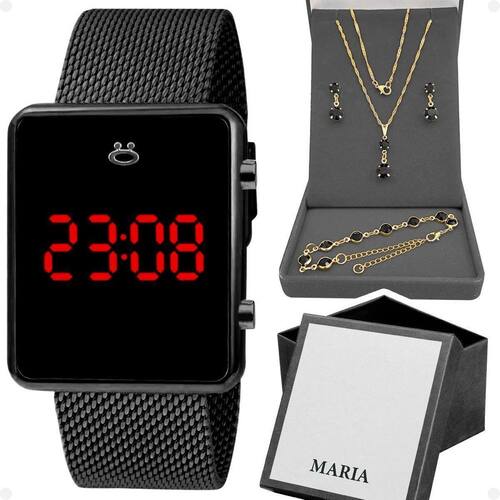 Relogio feminino digital preto + brincos + colar + caixa Kit Presente Orizom Maria - Relógio Feminino Digital e Conjunto de Joias