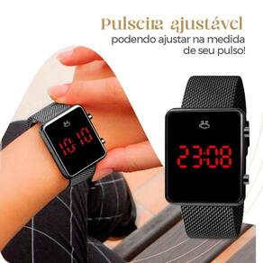 - Relógio Feminino Digital Orizom Maria: O relógio de design contemporâneo possui caixa quadrada na cor preto black piano, destacando-se pelo acabamento de alta qualidade. A pulseira em silicone ajustável se adapta confortavelmente a qualquer tamanho de pulso, enquanto a tampa blindada exibe uma arte exclusiva em forma de coração, conferindo um toque de exclusividade ao item.