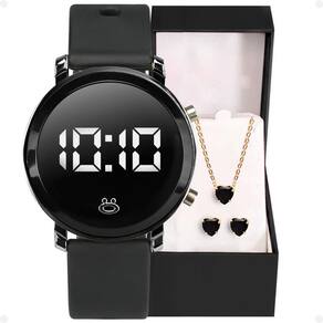 Relogio feminino digital preto + colar social qualidade premium presente redondo silicone casual Kit de Presente Orizom Maria: Relógio Feminino Digital e Colar com Pingente de Strass em Caixa Exclusiva