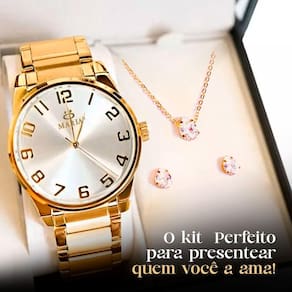 "Kit Completo Orizom Maria: Relógio Analógico Dourado + Acessórios Banhados"Surpreenda a Maria da sua vida com este conjunto deslumbrante, projetado para realçar a elegância e o estilo dela. O Relógio Feminino Analógico Orizom Maria é uma verdadeira obra-prima, banhado em ouro e feito com aço inoxidável de alta durabilidade, enquanto o colar banhado em ouro adiciona charme e requinte ao visual. O pingente e o par de brincos em forma de coração, adornados com strass transparente, simbolizam amor e delicadeza em cada detalhe.Armazenados com segurança e estilo na caixa ultra premium, este conjunto é o presente perfeito para aniversários, datas comemorativas ou simplesmente para mostrar amor e apreço. Adquira agora o Kit Completo Orizom Maria e faça da sua Maria o centro das atenções com elegância e sofisticação. A beleza e a qualidade estão ao seu alcance!