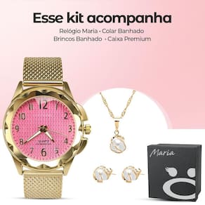 Relogio feminino dourado aço prova dagua + colar + pulseira pulseira ajustavel silicone fundo rosa Kit Luxo Dourado para Mulheres Sofisticadas: - Relógio Analógico Dourado Banhado à Prova d'Água: realce sua beleza com este acessório refinado e durável para qualquer ocasião. - Pulseira em silicone ajustável: conforto e estilo para um ajuste personalizado. - Par de Brincos de Pérola: adicione elegância ao seu visual. - Colar Banhado deslumbrante: sofisticação e charme garantidos. - Caixa Premium Orizom Maria: armazene seus acessórios com segurança e estilo. Adquira agora este conjunto único para elevar seu estilo a um novo patamar. Surpreenda-se com a combinação perfeita de beleza e sofisticação