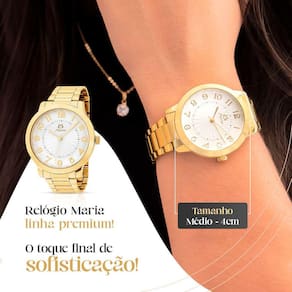O que está incluso no kit: - 1 Relógio Feminino Analógico Orizom Maria: Confeccionado em aço inoxidável na cor dourada, este relógio apresenta um design clássico e refinado, perfeito para adicionar um toque de sofisticação a qualquer visual. - 1 Colar em Aço Inoxidável de 50cm de Comprimento: Um colar versátil e delicado, ideal para diversas ocasiões. Seu design minimalista acrescenta elegância ao look. - 1 Par de Brincos de Strass e Aço Inoxidável: Brincos deslumbrantes que combinam o brilho do strass com a durabilidade do aço inoxidável, adicionando um toque de glamour ao estilo. - 1 Caixa Premium Orizom Maria: Perfeitamente projetada para guardar o relógio e acessórios com segurança e estilo.