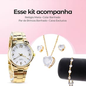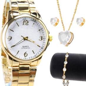 - Relógio analógico feminino dourado banhado a 18k, à prova d'água e feito em aço inoxidável, proporcionando estilo e durabilidade para o uso diário. - Colar banhado com pingente em strass transparente, acrescentando um toque de elegância e brilho sutil ao visual. - Par de brincos banhados com pedrinha de strass transparente, oferecendo um complemento delicado e sofisticado para qualquer ocasião. - Pulseira banhada com vários strass transparentes, adicionando um toque de brilho e glamour ao conjunto.