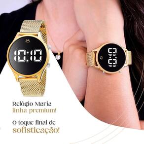 - Relógio Feminino Digital Orizom Maria - Modelo: Maria - Formato: Redondo - Diâmetro da Caixa: Aprox. 3,5 cm - Cor: Dourado Banhado - Mostrador: Preto com números brancos ou vermelhos - Material: Maquinário em aço inoxidável - Tampa: Blindada com arte exclusiva e logo da Orizom - Pulseira: Silicone, ajustável, para qualquer tamanho de pulso