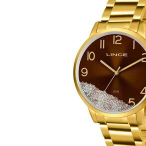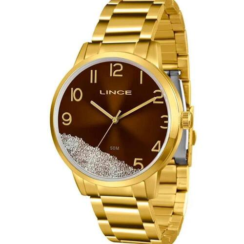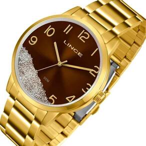 Relógio Feminino Dourado Lince, perfeito para aquela mulher ama brilho, caixa em metal dourado, com visor marrom e cristais dentro do vidro em cristal mineral para dar aquele charme e brilho ao seu estilo e perfeita combinação com a pulseira em aço dourado e com mecanismo analógico e resistência a água 5ATM.