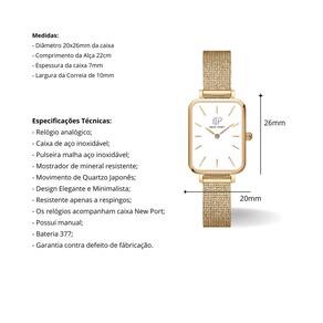 O Relógio Feminino New Port Quadrado Vermont Gold, com sua pulseira de aço inoxidável dourado, exibe dimensões de 20x26mm. A caixa é confeccionada em metal dourado, harmonizando com o mostrador branco protegido por um vidro de mineral resistente.