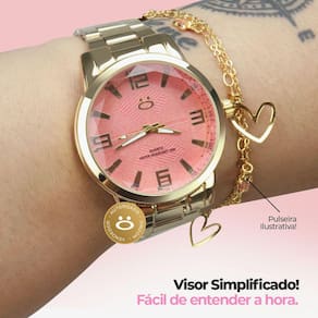 **Relógio de Pulso Feminino Orizom Maria:** - Design Analógico - Banhado a Ouro - Mostrador Rosa - Aço Inoxidável