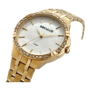 Relógio Feminino Dourado Seculus Com Semijoias77114LPSKDS1 relógio analógico com folheação dourada, com caixa de metal com cristais aplicados, e mostrador em madrepérola. Sua pulseira é aço super resistente com fecho de acionamento lateral de fácil ajuste, ideal para todos os pulsos, inclusive para os médios e finos. Para acompanhar o relógio, um colar de pedras e um par de brincos combinando com o design da peça. Esse relógio possui a caixa com 3,8 cm de tamanho. Ean: 7909669074953
