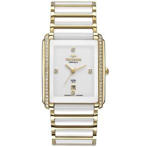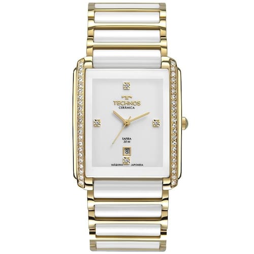 características composição do vidro: cristal safira material da caixa: aço inox cor da caixa: dourado e branco material da pulseira: aço inox e cerâmica cor da pulseira: branco e dourado mostrador: fundo branco com data
