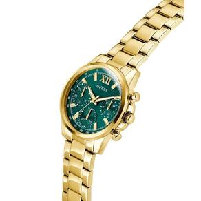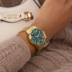 Relógio Feminino Guess Bailey GW0933L6 Dourado O relógio apresenta um mostrador dourado multifuncional com submostradores para dia da semana, data e hora em formato de 24 horas. O estojo de 36 mm é feito de aço inoxidável polido, complementado por uma pulseira de elos metálicos dourados e um fecho dobrável. Possui resistência à água de até 30 metros 3 ATM , adequada para uso diário e proteção contra respingos. Além disso, o modelo é descrito como parte da coleção Bailey da Guess, que combina elementos de estilo clássico com toques modernos, oferecendo peças versáteis e sofisticadas. Especificações Técnicas Mecanismo: Analógico Quartzo Gênero: Feminino Visor: Verde Vidro: Cristal mineral Resistente à água: 30m Características: Submostradores para dia da semana, data e hora Diâmetro da caixa: 28mm Tipo de fecho: Fivela Simples : 1 ano pela fabricante Guess Marca: Não Informado