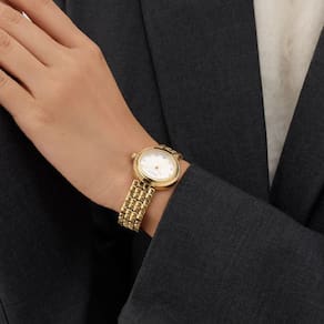 Encante-se com o toque sofisticado do Guess GW0930L4, um relógio feminino que combina estilo, delicadeza e responsabilidade. Com caixa compacta de 28 mm em aço reciclado na tonalidade dourada, mostrador branco e detalhes em cristais assimétricos no aro, ele se destaca tanto em looks do dia a dia quanto em ocasiões especiais. A pulseira trabalhada em aço reciclado com textura tipo bead completa o visual com charme e suavidade no pulso.