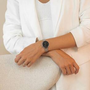 Este relógio ultrafino repousa delicadamente no braço e possui uma pulseira de malha prata um sofisticado mostrador preto.