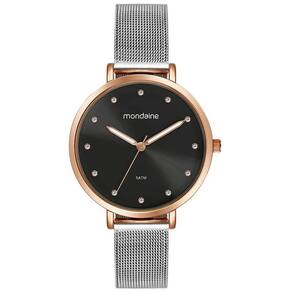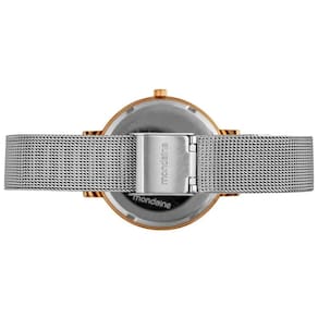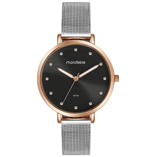 Relógio Feminino Mondaine Cristais Malha Prata com Rosé 32847LPMVGE2 Referência: 32847LPMVGE2 Este relógio analógico apresenta um mostrador preto com acabamento mate, complementado por marcações com cristais que adicionam brilho discreto. Os ponteiros com efeito luminoso garantem fácil leitura, mesmo em ambientes com pouca luz. A caixa em metal rosé de 3,6 cm de diâmetro destaca-se pelo design clean. Sua pulseira em malha de aço cromada, resistente e confortável, conta com um fecho de pressão que proporciona um ajuste perfeito ao pulso. Ideal para quem busca um acessório refinado com toques de brilho e funcionalidade. Especificações ATM - Pressão Máxima 5 ATM Altura 9 mm Comprimento Do Relógio 22 cm Número Elos Removíveis 0 Alarme Não Tamanho Da Caixa 36 mm Tamanho Do Vidro 33 mm Garantia 1 Ano Largura Da Pulseira 14 mm Saiba o tamanho ideal para você: Relógio Feminino Até 35 mm: Pulso P De 36 a 38 mm: Pulso M De 39 a 40 mm: Pulso G Acima de 40 mm: Pulso GG