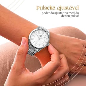 Relogio feminino prata + colar strass + caixa + brincos Kit Especial Orizom Maria para Presentear Quem Você Ama