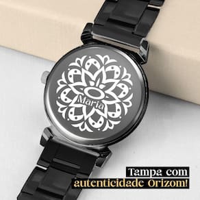 - Relógio Feminino Orizom Maria: Com maquinário analógico, pulseira e mostrador na cor preto black piano, proporcionando um visual elegante e sofisticado. A tampa traseira é blindada e possui uma arte exclusiva da Orizom, reforçando sua autenticidade e atenção aos detalhes.
