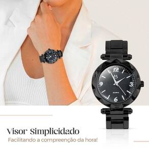 - Relógio Feminino Orizom Maria: Relógio analógico com maquinário, pulseira e mostrador na cor preto black piano, proporcionando um visual elegante e sofisticado. A tampa traseira é blindada e possui uma arte exclusiva da Orizom, reforçando sua autenticidade e atenção aos detalhes. Detalhes internos e externos podem variar de acordo com montagem do relógio no ato da compra.