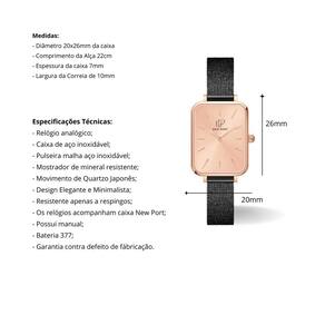 O Relógio Feminino New Port Quadrado Vermont Black Fundo Rosé Gold, com sua pulseira de aço inoxidável preta, apresenta dimensões de 20x26mm. A caixa é elaborada em metal rosé gold, com o mostrador também em rosé gold, que é protegido por um vidro de mineral resistente. Este relógio é a escolha ideal para todas as ocasiões. Um acessório essencial que se adapta perfeitamente ao seu estilo, seja em ambientes corporativos ou eventos sociais mais requintados. Sua versatilidade e proteção o tornam um complemento perfeito, adicionando um toque distinto tanto em contextos profissionais quanto em momentos de alegria social. A pulseira é de fácil ajuste e se adapta bem a todos os pulsos. Medidas: - Diâmetro 20x26mm da caixa - Comprimento da Alça 22cm - Espessura da caixa 7mm - Largura da Correia de 10mm