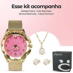 Relogio Feminino Prova Dagua Aço Banhado + Colar + Pulseira Pulseira Ajustavel Qualidade Premium Kit Luxo Dourado para Mulheres Sofisticadas: - Relógio Analógico Dourado Banhado à Prova d\'Água: realce sua beleza com este acessório refinado e durável para qualquer ocasião. - Pulseira em silicone ajustável: conforto e estilo para um ajuste personalizado. - Par de Brincos de Pérola: adicione elegância ao seu visual. - Colar Banhado deslumbrante: sofisticação e charme garantidos. - Caixa Premium Orizom Maria: armazene seus acessórios com segurança e estilo. Adquira agora este conjunto único para elevar seu estilo a um novo patamar. Surpreenda-se com a combinação perfeita de beleza e sofisticação!