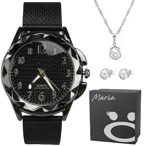 Relogio Feminino Prova Dagua Aço Inox + Pulseira + Colar Qualidade Premium Resistente Presente Moda Kit Sofisticação Noturna para Mulheres Modernas! Destaque-se com o elegante Relógio Feminino Analógico Preto (Black Piano), à prova d\'água e com maquinário em aço inoxidável para garantir durabilidade. A pulseira em silicone ajustável proporciona o ajuste perfeito para qualquer tamanho de pulso.