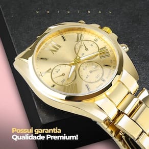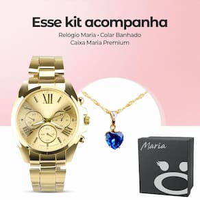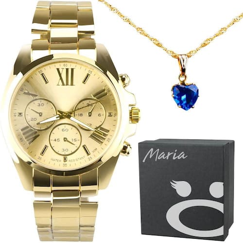 Relogio Feminino Prova Dagua Banhado + Colar Ouro + Caixa Dourado Aço Inoxidavel Social Casual Aproveite o Presente Perfeito! Conjunto Elegante Orizom Maria Relógio Analógico Feminino: à prova d'água, em aço inoxidável banhado a ouro dourado.