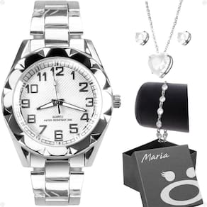 O kit inclui: - Relógio Analógico à Prova D'água - Cor Prata, todo em aço inoxidável. - Colar em Aço Inoxidável - Pingente de Strass em Forma de Coração, para um brilho elegante e delicado. - Par de Brincos em Aço Inoxidável - Design de Coração com Pedrinha, adicionando um toque de charme sutil aos seus ouvidos. - Pulseira em Aço Inoxidável - Decorada com Pedrinhas para um estilo refinado e contemporâneo. Marca: Não Informado Ean: 7894576431107