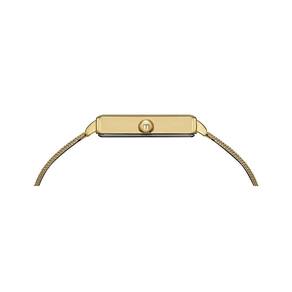 Este relógio analógico possui caixa slim quadrada em metal, mostrador minimalista, sem numeração, com pequenos cristais nos marcadores e pulseira semi sólida em malha de aço com fácil ajuste ao pulso. Um relógio elegante e casual para usar todos os dias.