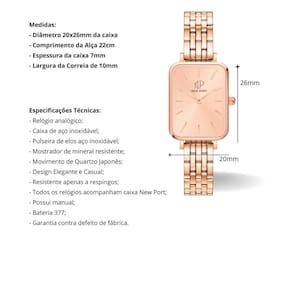 Descubra a Coleção Milano, onde o clássico encontra a modernidade com um toque sofisticado. Cada peça foi cuidadosamente desenhada para oferecer uma elegância discreta e versatilidade incomparável, ideal tanto para ocasiões casuais quanto para eventos mais formais. Apresentamos o Relógio New Port Venezia Gold Rosé 26mm, uma verdadeira obra-prima de requinte. Com sua luxuosa pulseira de metal com elos ouro rosé meticulosamente trabalhados, este relógio destaca-se pela transição suave e harmoniosa entre a caixa e o fecho. Deixe-se envolver pelo charme e pela precisão de um design que redefine o que significa estar na moda. O New Port Venezia Ouro Rosé é mais do que um acessório, é uma afirmação de estilo e sofisticação. A pulseira é de fácil ajuste e se adapta bem a todos os pulsos. Medidas: - Diâmetro 20x26mm da caixa - Comprimento da Alça 22cm - Espessura da caixa 7mm - Largura da Correia de 10mm ***Não acompanha ferramenta para ajuste de pulseira*** Especificações Técnicas: - Aço Inoxidável; - Pulseira de metal com elos; - Mostrador de mineral resistente; - Movimento de Quartzo Japonês; - Design Minimalista e Casual; - Resistente apenas a respingos de água; - Todos os relógios acompanham caixa da New Port; - Possui manual New Port; - Bateria 377 para melhor durabilidade; - Relógio analógico; - Garantia contra defeito de fábricação.