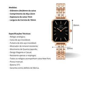 Descubra a Coleção Milano, onde o clássico encontra a modernidade com um toque sofisticado. Cada peça foi cuidadosamente desenhada para oferecer uma elegância discreta e versatilidade incomparável, ideal tanto para ocasiões casuais quanto para eventos mais formais. Apresentamos o Relógio New Port Venezia Fundo Preto Rosé 26mm, uma verdadeira obra-prima de requinte. Com sua luxuosa pulseira de metal com elos ouro rosé meticulosamente trabalhados, este relógio destaca-se pela transição suave e harmoniosa entre a caixa e o fecho. Deixe-se envolver pelo charme e pela precisão de um design que redefine o que significa estar na moda. O New Port Venezia Fundo Preto Rosé é mais do que um acessório; é uma afirmação de estilo e sofisticação. A pulseira é de fácil ajuste e se adapta bem a todos os pulsos. Medidas: - Diâmetro 20x26mm da caixa - Comprimento da Alça 22cm - Espessura da caixa 7mm - Largura da Correia de 10mm ***Não acompanha ferramenta para ajuste de pulseira*** Especificações Técnicas: - Aço Inoxidável; - Pulseira de metal com elos; - Mostrador de mineral resistente; - Movimento de Quartzo Japonês; - Design Minimalista e Casual; - Resistente apenas a respingos de água; - Todos os relógios acompanham caixa da New Port; - Possui manual New Port; - Bateria 377 para melhor durabilidade; - Relógio analógico; - Garantia contra defeito de fábricação.
