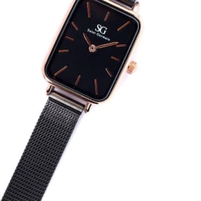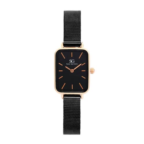 Relógio Feminino Saint Germain Quadrado Square Houston Rosé Gold com pulseira de aço inoxidável preta. A caixa é metal rosé gold e o mostrador preto, vidro com mineral endurecido com alta resistência.