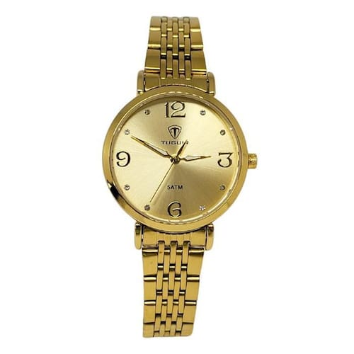 Relógio Feminino Relógio Tuguir Analógico Tg205 Dourado Relógio Feminino Relógio Tuguir Analógico Tg205 Dourado Marca: Tuguir Categoria: Analógico Analógico: Sim 1 Horário Ponteiros Fluorescentes: Sim Digital: Não Calendário: Não Despertador: Não Mostra o Dia da Semana: Não Mostra o Dia do Mês: Não Cronômetro: Não Contador Regressivo: Não Luz: Não Resistente à Água: 5 ATM Pode ser Utilizado para nadar no raso, por pouco tempo submerso - Respingos: Sim - Chuva: Sim - Lavar Carro: Sim - Lavar Louça: Sim - Natação: Sim - Mergulho: Não Característica do Vidro: Cristal Mineral Tipo de Fecho: Dobrável com Botão Cor da Caixa: Dourado Material da Caixa: Metal Banho IP Formato da Caixa: Redondo Diâmetro da Caixa: 32,00 mm Espessura da Caixa: 8,50 mm Cor da Pulseira: Dourado Material da Pulseira: Aço Largura da Pulseira: 12,00 mm Comprimento Máximo da Pulseira: 130,00 mm Alimentação: Bateria Interna Peso Líquido: 0,053 Kg Modelo: Tg205 Cor Predominante: Dourado : 12 Meses Conteúdo da Embalagem: 01 Relógio 01 Embalagem 01 Termo de