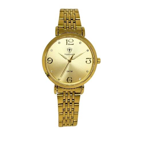 Marca: Tuguir Categoria: Analógico Analógico: Sim (1 Horário) Ponteiros Fluorescentes: Sim Digital: Não Calendário: Não Despertador: Não Mostra o Dia da Semana: Não Mostra o Dia do Mês: Não Cronômetro: Não Contador Regressivo: Não Luz: Não Resistente à Água: 5 ATM - Respingos: Sim - Chuva: Sim - Lavar Carro: Sim - Lavar Louça: Sim - Natação: Sim - Mergulho: Não Característica do Vidro: Cristal Mineral Tipo de Fecho: Dobrável com Botão Cor da Caixa: Dourado Material da Caixa: Metal Banho IP Formato da Caixa: Redondo Diâmetro da Caixa: 32,00 (mm) Espessura da Caixa: 8,50 (mm) Cor da Pulseira: Dourado Material da Pulseira: Aço Largura da Pulseira: 12,00 (mm) Comprimento Máximo da Pulseira: 130,00 (mm) Alimentação: Bateria Interna Peso Líquido: 0,053 Kg Modelo: Tg205 Cor Predominante: Dourado Garantia: 12 Meses