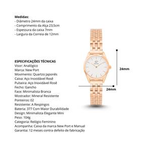 ESPECIFICAÇÕES TÉCNICAS Visor: Analógico Marca: New Port Movimento: Quartzo Japonês Caixa: Aço Inoxidável Rosê Pulseira: Aço Inoxidável Rosê Fecho: Gancho Face: Minimalista Branca Mostrador: Mineral Resistente Ponteiros: 02 Resistente: A Respingos Bateria: 377 Com Maior Durabilidade Design: Minimalista Elegante Mini Peso: 104g Categoria: Relógio Feminino Acompanha: Caixa da marca New Port e Manual Garantia: 12 meses contra defeito de fabricação