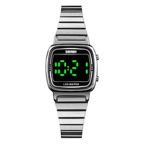 Relógio Feminino Skmei Digital 1543 - Prata Relógio Feminino Skmei Digital 1543 - Prata Marca: Skmei Categoria: Digital Analógico: Não Digital: Sim (1 Horário) Calendário: Não Despertador: Não Mostra o Dia da Semana: Sim Mostra o Dia do Mês: Sim Cronômetro: Não Contador Regressivo: Não Luz: Sim Cor da Iluminação: Verde Resistente à Água: 3 ATM (Resiste a imersões breves) - Respingos: Sim - Chuva: Sim - Lavar Carro: Sim - Lavar Louça: Sim - Natação: Não - Mergulho: Não Característica do Vidro: Acrílico Tipo de Fecho: Gancho Cor da Caixa: Prata Material da Caixa: Metal (Alloy) Formato da Caixa: Quadrado Comprimento da Caixa: 25,00 (mm) Largura da Caixa: 25,00 (mm) Espessura da Caixa: 9,00 (mm) Cor da Pulseira: Prata Material da Pulseira: Metal Largura da Pulseira: 10,00 (mm) Comprimento Máximo da Pulseira: 210,00 (mm) Alimentação: Bateria Interna Peso Líquido: 0,041 Kg Modelo: 1543 Cor Predominante: Prata Garantia: 12 Meses