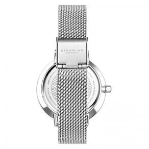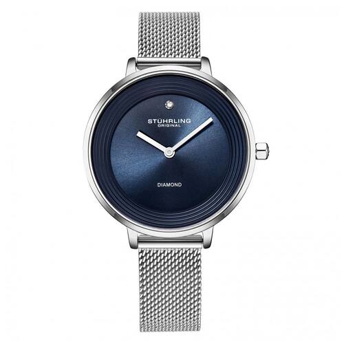 Relógio feminino de malha com diamante, caixa em tom de prata e pulseira de malha em tom de prata, mostrador azul, com detalhes em tom de diamante e prata