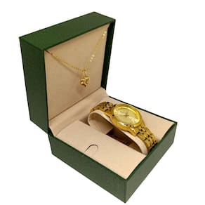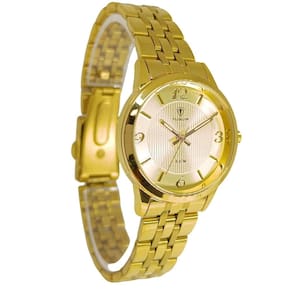 Relógio Feminino Tuguir Analógico 9182A DouradoMarca: Tuguir Categoria: Analógico Analógico: Sim (1 Horário) Ponteiros Fluorescentes: Selecione Digital: Não Luz: SelecioneResistente à Água: 5 ATM (Pode ser utilizado para nadar no raso, por pouco tempo submerso) - Respingos: Sim - Chuva: Sim - Lavar Carro: Sim - Lavar Louça: Sim - Natação: Sim - Mergulho: Não Característica do Vidro: Cristal Mineral Tipo de Fecho: Dobrável com Botão Cor da Caixa: Dourado Material da Caixa: Metal Banho IP Formato da Caixa: Redondo Diâmetro da Caixa: 32,00 (mm) Espessura da Caixa: 9,00 (mm) Cor da Pulseira: Dourado Material da Pulseira: Aço Largura da Pulseira: 13,50 (mm) Comprimento Máximo da Pulseira: 260,00 (mm) Alimentação: Bateria Interna Peso Líquido: 0,060 Kg Modelo: 9182A Cor Predominante: Dourado Garantia: 12 MesesConteúdo da Embalagem: 01 Relógio 01 Embalagem 01 Termo de Garantia
